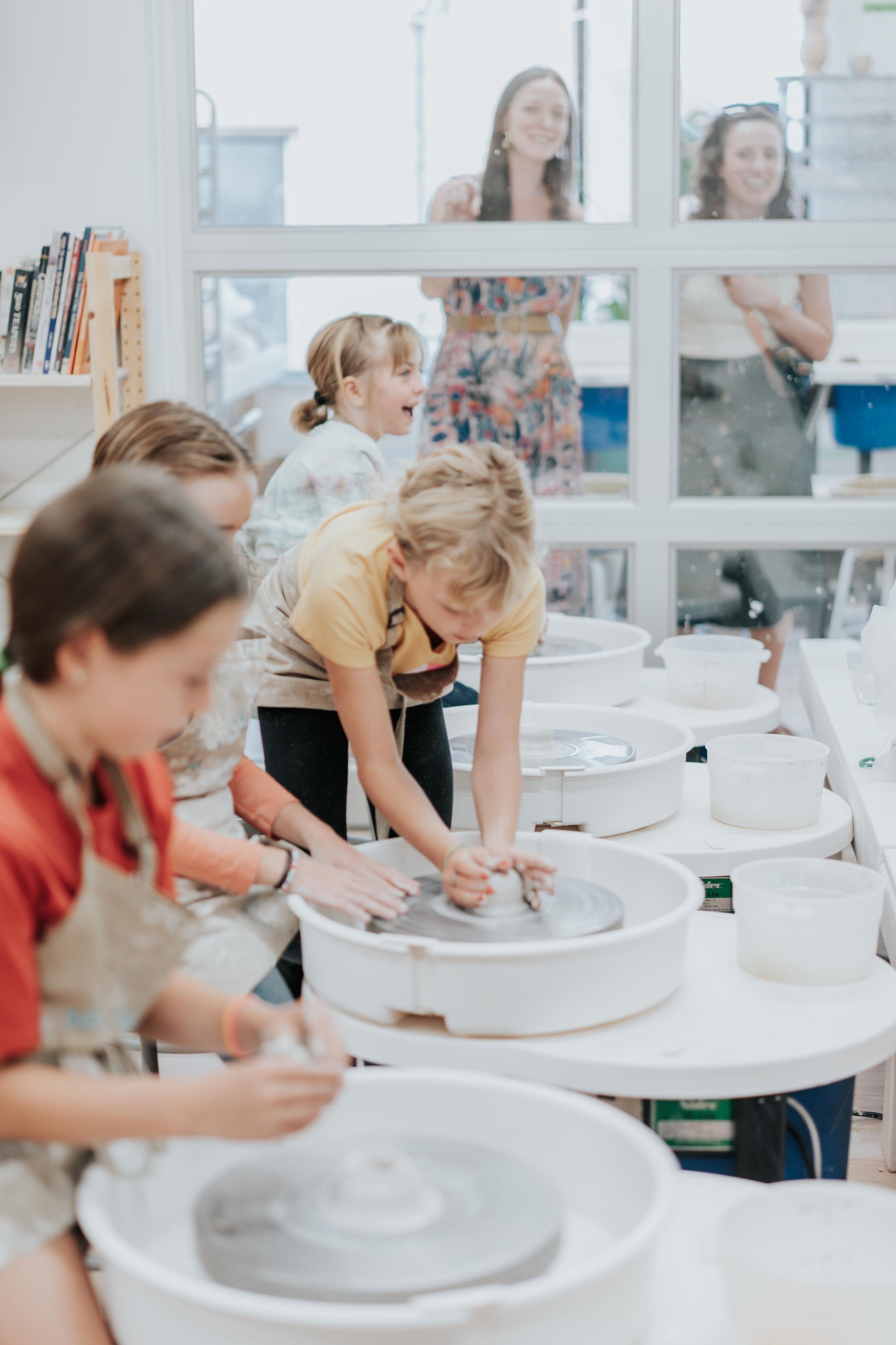 The Teaching Studio in Clay Hub is a fantastic place to learn and practice pottery! The Teaching Studio features 14 student wheels, two 8’x3’ work tables, plenty of storage space, and an awesome demo wheel with an overhead camera and screen! At Clay Hub, we run both daytime and evening classes for adults, after school classes for children and teens, a variety of hand building and wheel throwing Workshops for adults as well as Make-Together Workshops, birthday parties, private events, and more.
