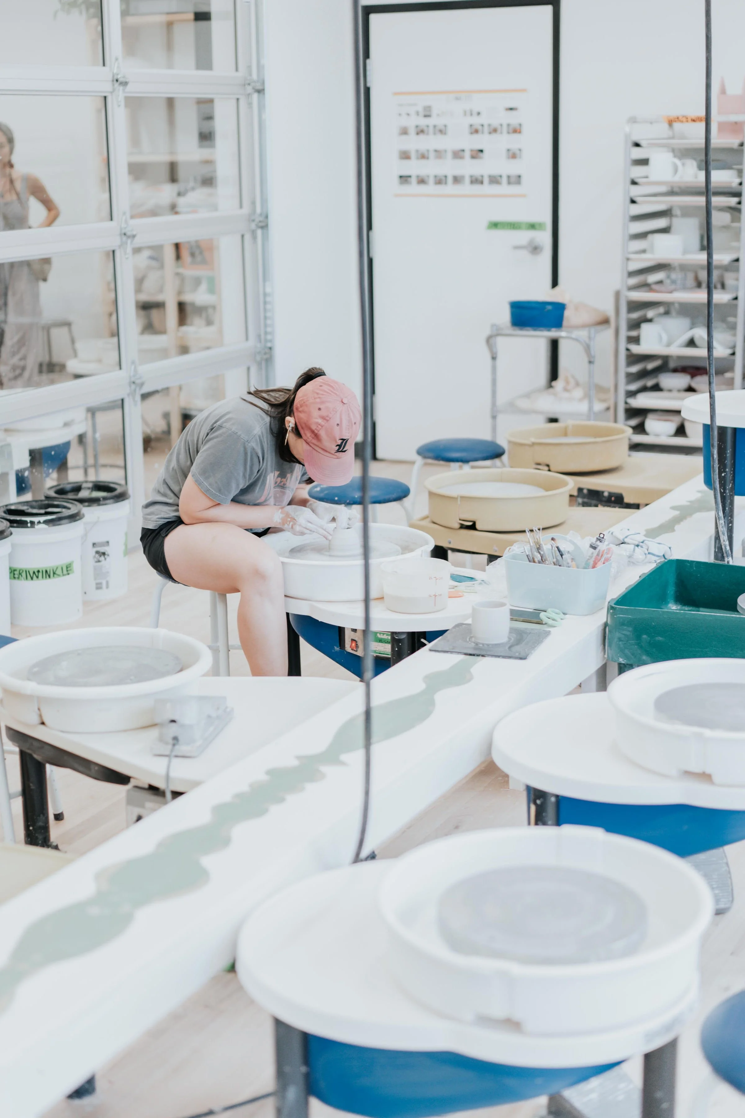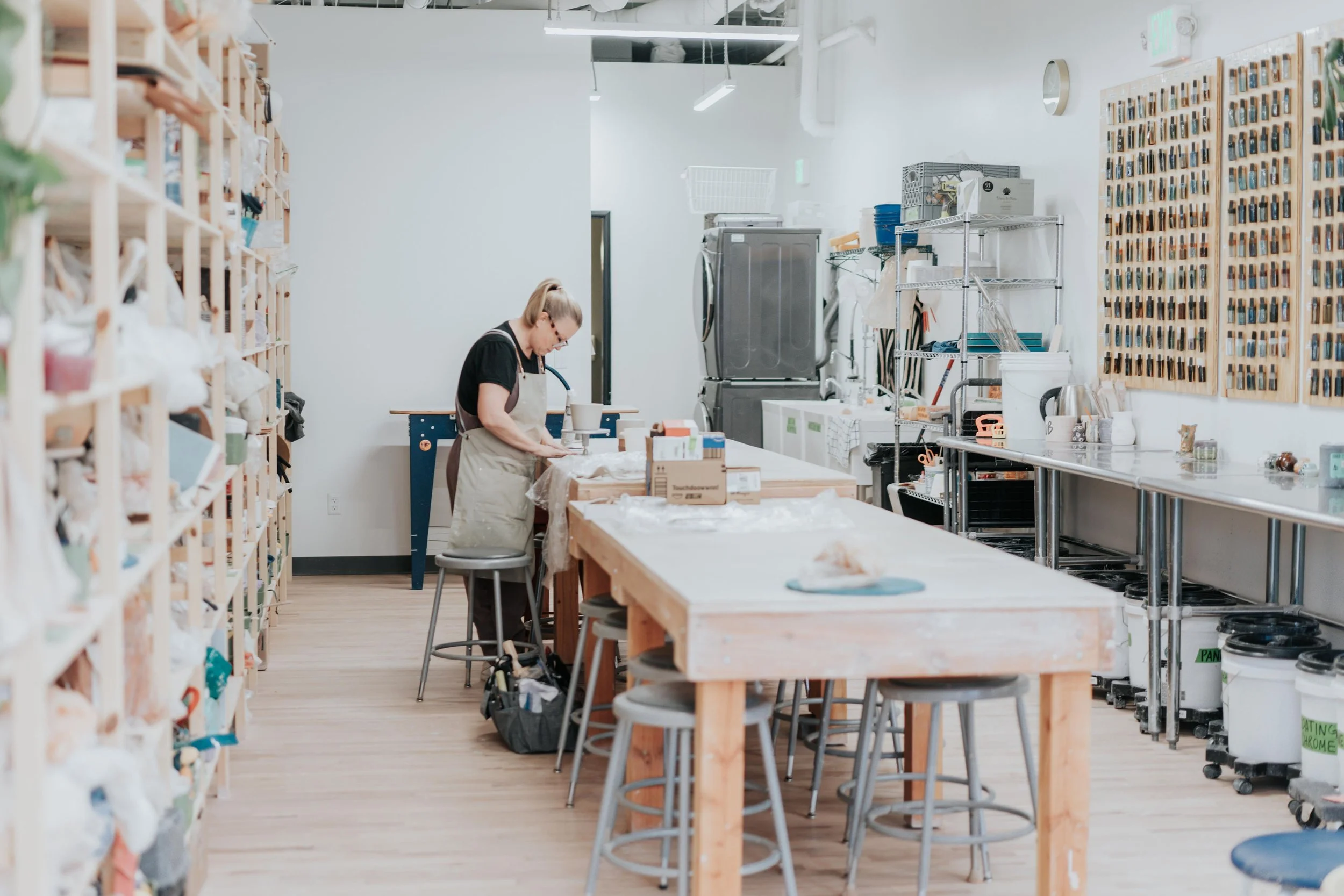 ✅ Access to high quality equipment: Large custom work tables, glazing tables, 12 pottery wheels, and a slab roller.